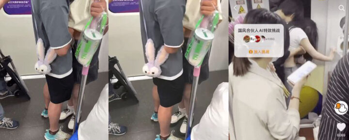 两位当事人似乎将周围的路人视为他们表演的一部分。在地铁上人流密集的情况下,他们竟然能做出如此不雅的行为。男子的手不断在女子的双腿之间游走,甚至连她的内裤都清晰可见。