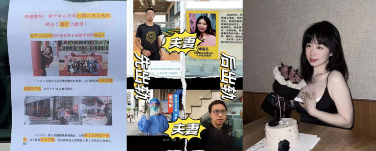 这个瓜着实有点乱,常平小学的一名女教师曾祖怡出轨自己的同事温柿权,被正宫钟洁儿发现欧上门理论,结果没想到钟洁儿这么一来二去,竟然和曾祖怡的老公陈炽豪看对眼了,结果就是四人双双出轨,现场堪比感情伦理大剧,此后被陈炽豪老婆也就是先出轨的曾祖怡发现,提前先发制人,到处印发大字报。