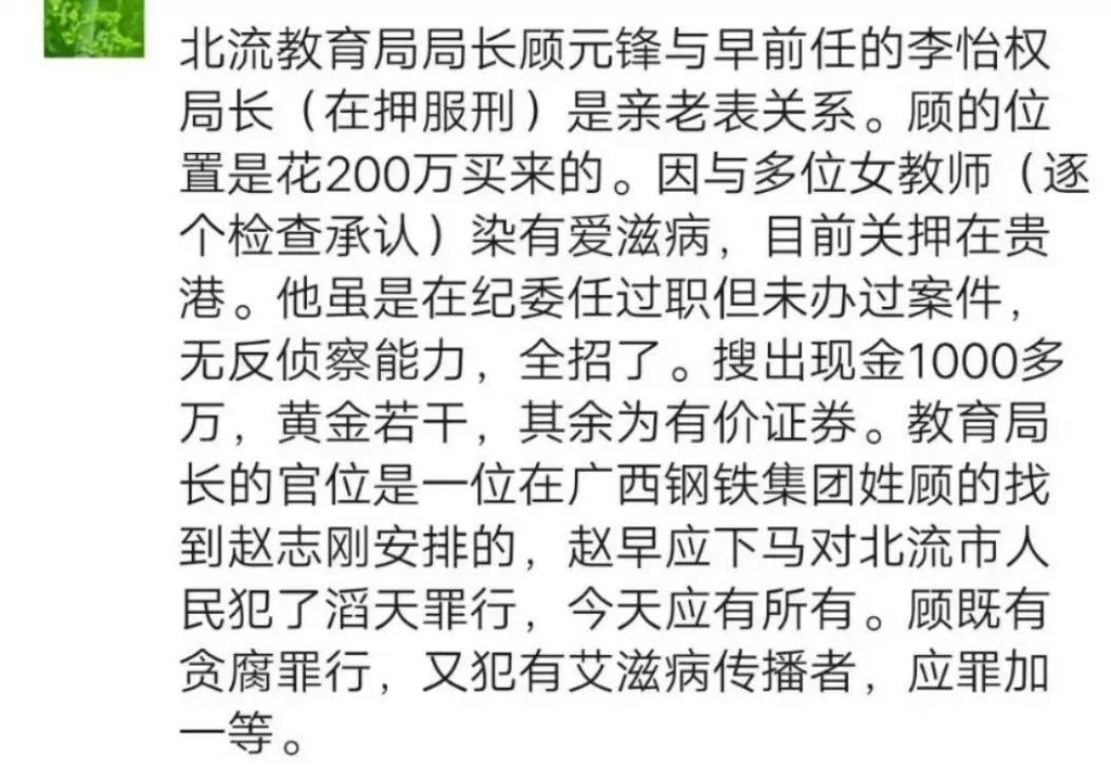 广西北流教育界爆出惊人丑闻:据网上传闻,北流教育局局长涉嫌醉酒驾驶,并与多名女性发生性关系,造成他人感染艾滋病毒,目前已被警方逮捕。此外,网络上还流传着多张截图,显示该局长涉嫌买卖官职等违纪违法行为。