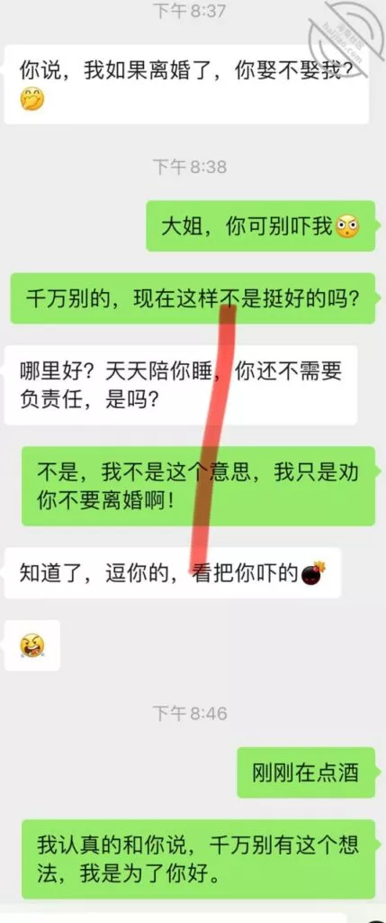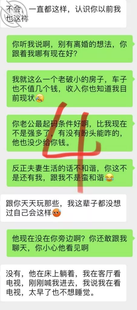 兄弟们,我最担心的事情还是发生了,昨天她老公回来了,这老兄也真逗的,我如果没记错她应该又快来大姨妈了,上次回来也是赶上来姨妈;今天也不知道是咋的了,到底是吵架了,还是就单纯的看着烦,问了也没跟我说具体的,反正所以就有了以下的聊天记录,哎,大家自己看吧,我现在真的是愁得很:兄弟们,虽然这个话题是略过了,但是我现在依旧还是很担心,女人这个东西吧,我是比较了解的,对于她们而言,尤其这种良家女,基本没有单纯身体出轨这一说,一定是身心一起的;虽然说是逗我的,但我不太相信,她一定是有这个想法,最起码是在那一瞬间是有这个想法了,而且还会纠结了很久才会发那条消息给我;说真的,这是我最担心的事情,我是不可能跟她过的,这点我很确信,首先我不想为了一棵小草放弃整片森林,我现在完全不想再有束缚,再有,我如果希望有个完整的家庭,那我肯定首选跟前妻复婚,再然后,我就算复不了婚,我大概率也不会去找个离婚的女人,