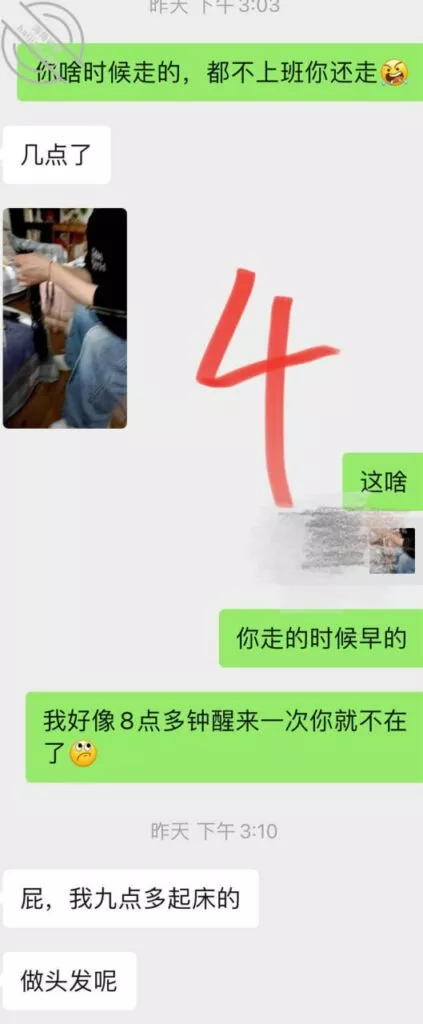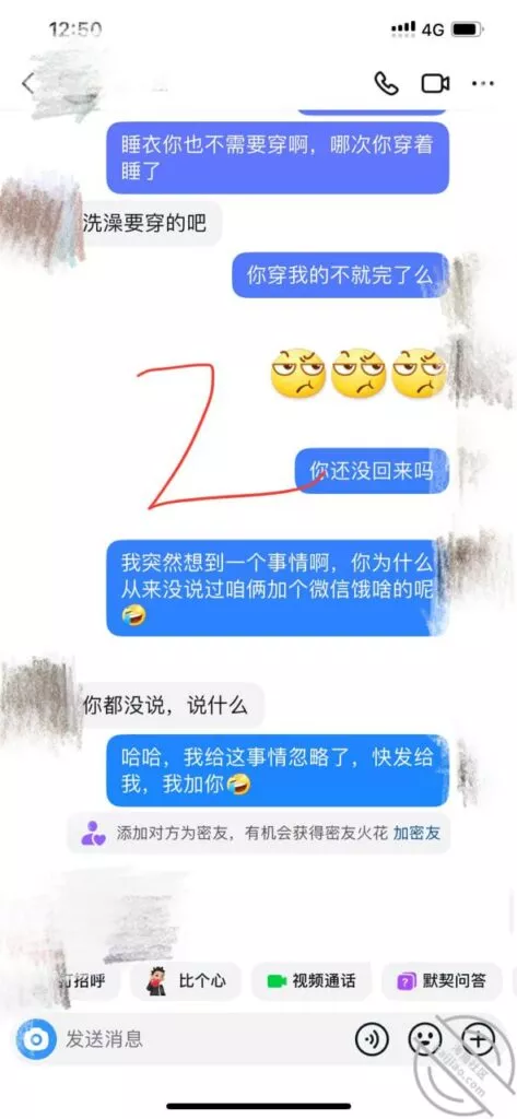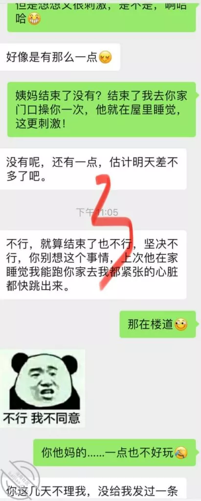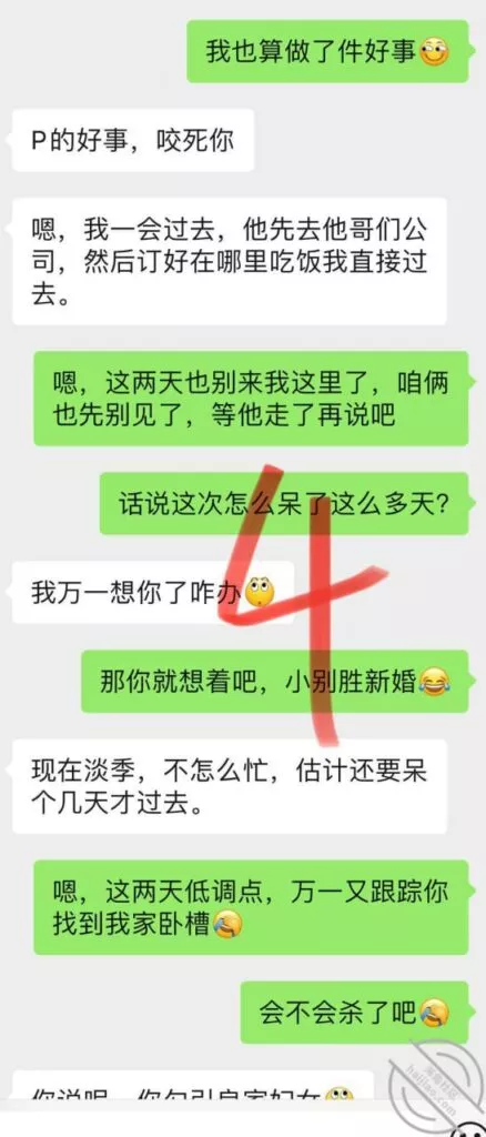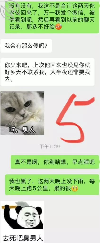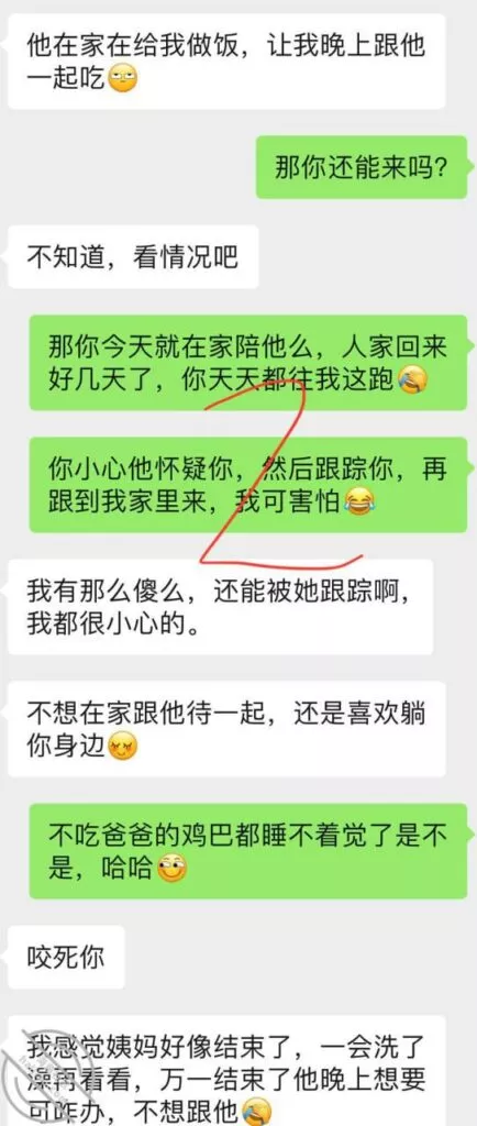 兄弟们差点出了大事啊,差点被他老公发现,幸好我们俩还都算机灵,然后她老公不算太机灵,不然可就惨了,后果不堪设想;事情是这样的,昨天她不是大早晨天刚亮就来找我Cao了一下吗,结果回去的时候她老公已经醒了,问题是她穿着睡衣出来的啊,我知道不管她怎么解释,她老公肯定是不会相信她的,现在心里肯定已经是怀疑她有人的,而且但凡有点脑子都能想到这个人肯定离得很近;先发聊天记录给大家看吧:以上就是昨天下午我俩的聊天记录了,本来昨天要发,结果呢临时有事情我要出去,才有时间登陆,兄弟们自己看吧;居然还跟踪她,这人脑子也是似乎有点不大够用,这种情况下跟踪能跟踪出个毛线啊,换了我,肯定装不知道啊,手机也不应该去查,就完全装不知道,完全相信她,叫她放松警惕,回头那不是一跟一个准啊,不过也算躲过一劫,真的要是被她老公知道我家地址,换了你们,会不会来敲门?这几天Cao不了了,还是暂且低调点吧,安全为主啊!也不知道这人啥时候走,我问她她也不知道,正好就当休息一下了。