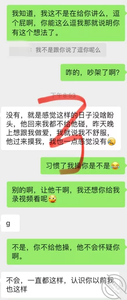 我给兄弟们照片你们看看是不是很反差的感觉:我觉得光看视频照片也没意思的,整个心路历程啊什么的,心理活动,日常的沟通也都要分享分享,看着感觉不一样不说吧,或许还能有一些经验能分享给各位;从上次她试探我,如果离婚了她能不能跟我过以后,我就再也没跟他说过话,这些天没见面也没联系,我必须让她长点记性,不能想多余的事,今天估计她自己忍不住了,下午主动发个微信给我:这里她问我什么时候回家,是什么时候回老家,因为老家有事情,最近确实需要回去一次,她其实也知道我什么时候走,不过人家既然主动来找你了,那咱也就正常回答呗,下午就说了这么几句,我也很敷衍;结果到了晚上遇到了:前面提到过的,她老公在旁边,捏了一下她屁股,今天想尝试去她家门口Cao她,说什么都不同意,明天大姨妈结束了,之前一直答应各位的,带着我的体液回去给她老公Cao,一直也没完成,我明天要挑战一下,大家祝我成功哈,