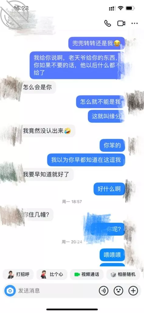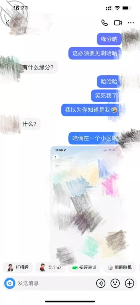 居然同小区,天底下有这么巧合的事情,电视剧都不敢这么演吧,事情是这样的,不是认识了某音上的一个已婚的女的,然后前些天我在momo上聊过的一个距离非常近的人,但是没有照片也没有头像,今天又想起来找她聊天,我想说看看她照片,结果………就这样了,朋友们自己看聊天记录吧,这个是momo的聊天记录,这个是某音的聊天记录。我真是万万没想到,天底下居然会有如此的巧合,居然是一个人,我们还住在一个小区,只是他没告诉我住在几幢。话说回来,我已经单身很久了,也很久没有性生活了。现在怎么突然感觉春天要来了,既然这么有缘分,那我必须努力把他拿下啊,《我的美女邻居》系列吗?啊哈哈哈哈哈,PS:由于第一次发帖没有经验,不会调整顺序,上一贴聊天记录完全乱了,但是大家应该能知道观看顺序吧,上面也带着时间,这个帖子也是,顺序好像是反过来的,如果接下来还有后续,我会把它调整好,如果不发了,那就是搞不定