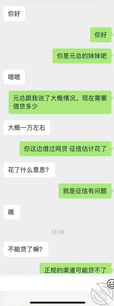 随后便是加上了我的小号开始聊天,我的小号也表示你的征信最近太花了,负债短时间内升高太多,很难有正规合法的路子能批下来了弟妹就像溺水的人,眼见最后一根浮木都要飘走,正当绝望之时我的小号及时的添补上了一句。