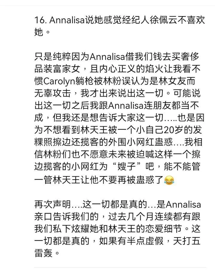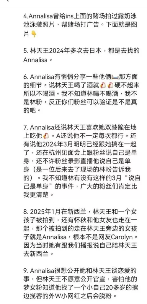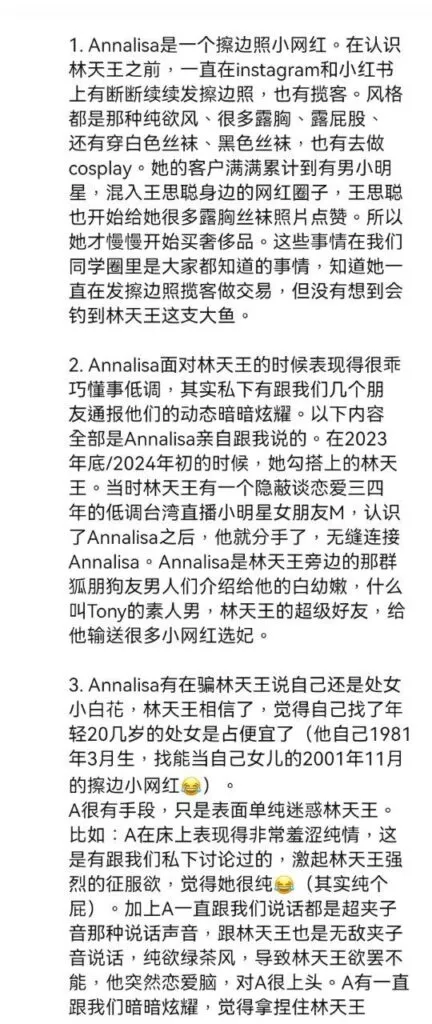 沉寂已久的娱乐圈再次爆出劲爆新闻,曾经的乐坛天王林俊杰被爆料与一位出生于2001年的女友annalisa交往,二人年龄相差整整20岁。据内幕人士透露,这位新任女友曾是一名地下福利姬,即外围女,大量想关黑料被曝光,不知道林俊杰得知真相后还能不能淡定。