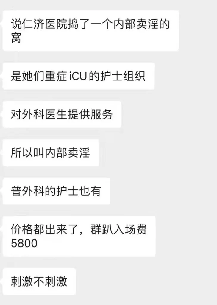 近日,有网络传言称上海交通大学附属医院仁济医院的外科医生参与嫖娼,更有爆料指称该医院某科室涉嫌集体组织卖银活动。据悉,仁济医院内部调查发现ICU科室的一名护士确实存在组织卖银行为,并为外科医生提供性服务,甚至涉及多人银乱聚会。对此,仁济医院迅速发表声明,强调这些消息为不实信息,极有可能是谣言。