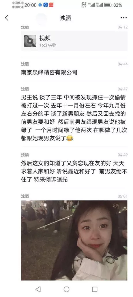 一个月你绿我两次?南京泉峰精密公司王亚蓉脚踏多只船被男友曝光记录