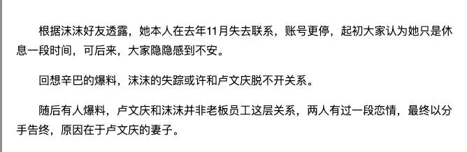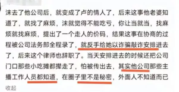 而在爆料结束后,更是有很多消息灵通人士曝光了沫沫进入三只羊公司后,成为卢文庆的地下情人,事情败露后索要天价分手封口费,所以为了企业名誉问题,小杨哥联合其余几位高管,把沫沫送了进去。